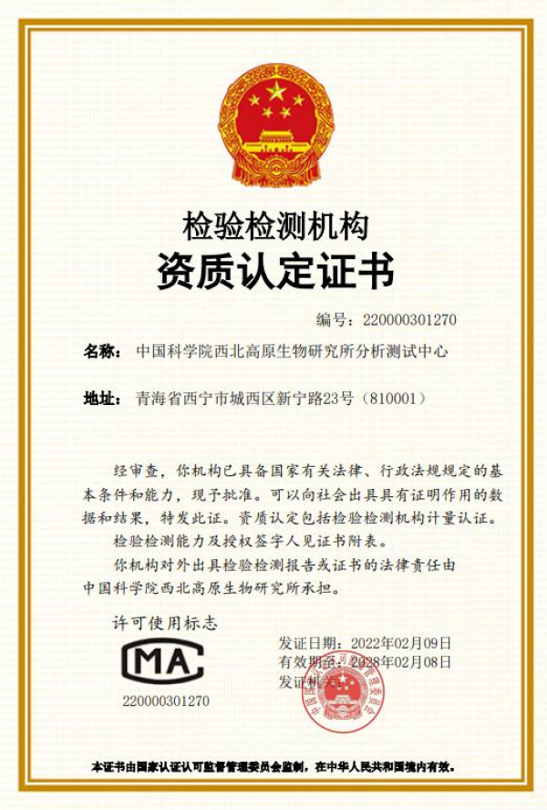 2022年02月09日,国家市场监督管理总局下发质量监督检验检疫准予行政许可决定书(国)质检(26023)许 准字[2022]000297号。依照《中华人民共和国行政许可法》第三十八条第一款和《检验检测机构资质认定管理办法》第九条的规定,准予西北高原所分析测试中心为社会提供公证数据产品质量检验机构计量认证,行政许可有效期至2028年02月08日。