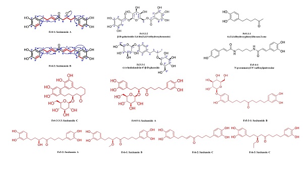 虎耳草科虎耳草属植物,民间以其全草入药,具有祛风、清热、凉血解毒等功效,传统用于治疗肝胆、风疹、湿疹、中耳炎、丹毒、咳嗽吐血、痔疾等疾病。中国科学院西北高原生物研究所藏药新药研究与开发学科组在前期研究中发现虎耳草属植物组分具有优异的体外清除自由基活性,但是并不清楚其所含的外源性自由基抑制剂物质基础。因此,学科组以DPPH自由基为靶标,以虎耳草属植物研究为例,构建了虎耳草属植物中自由基抑制剂的HPLC-DPPH在线筛选系统,是集在线筛选、靶向富集、定向纯化分离为一体的天然产物化学色谱研究体系。其次,基于HPLC-DPPH在线筛选系统,结合中压、高压色谱从黑虎耳草、黑蕊虎耳草和唐古特虎耳草植物中定向纯化分离并鉴定了51个自由基抑制剂,其中12个新化合物,1个新天然产物;最后,通过体外细胞实验阐明了唐古特虎耳草中3个新的二芳基壬烷类化合物Saxitanside A、Saxitansin B和Saxitansin D,具有抑制H2O2诱导的HepG2细胞氧化损伤的作用机制。